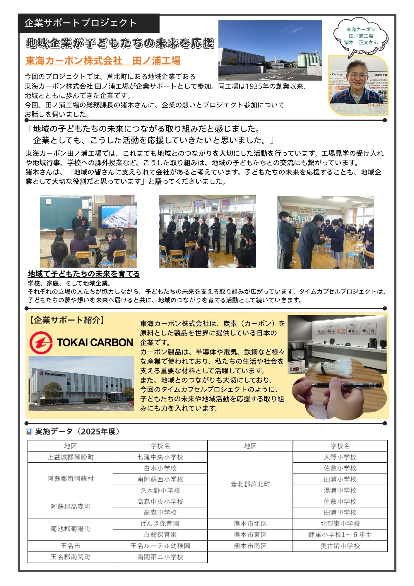 今回のプロジェクトでは、芦北町にある地域企業である、東海カーボン株式会社 田ノ浦工場が企業サポートとして参加。企業の想いとプロジェクト参加についてもお話しを伺いました。