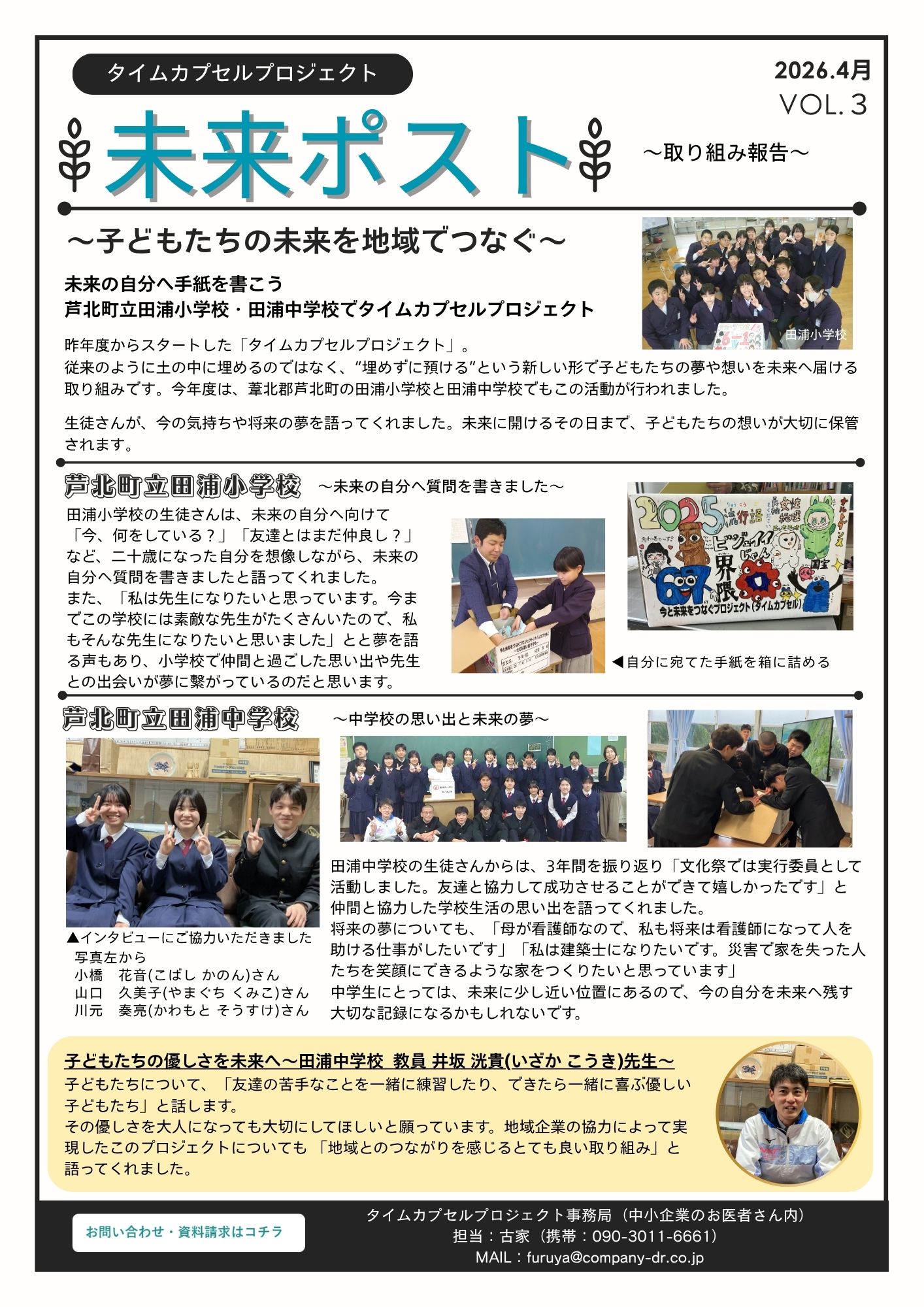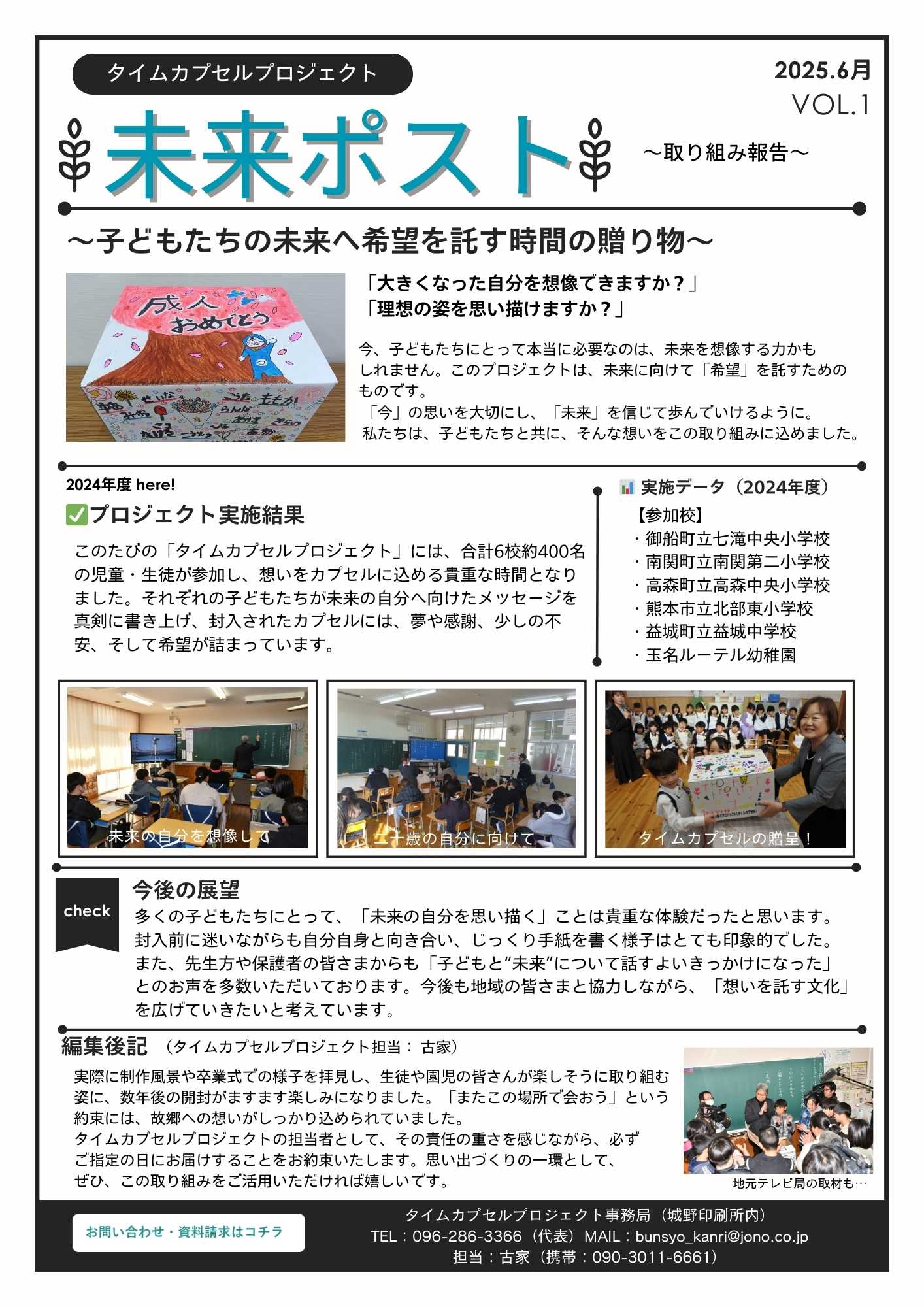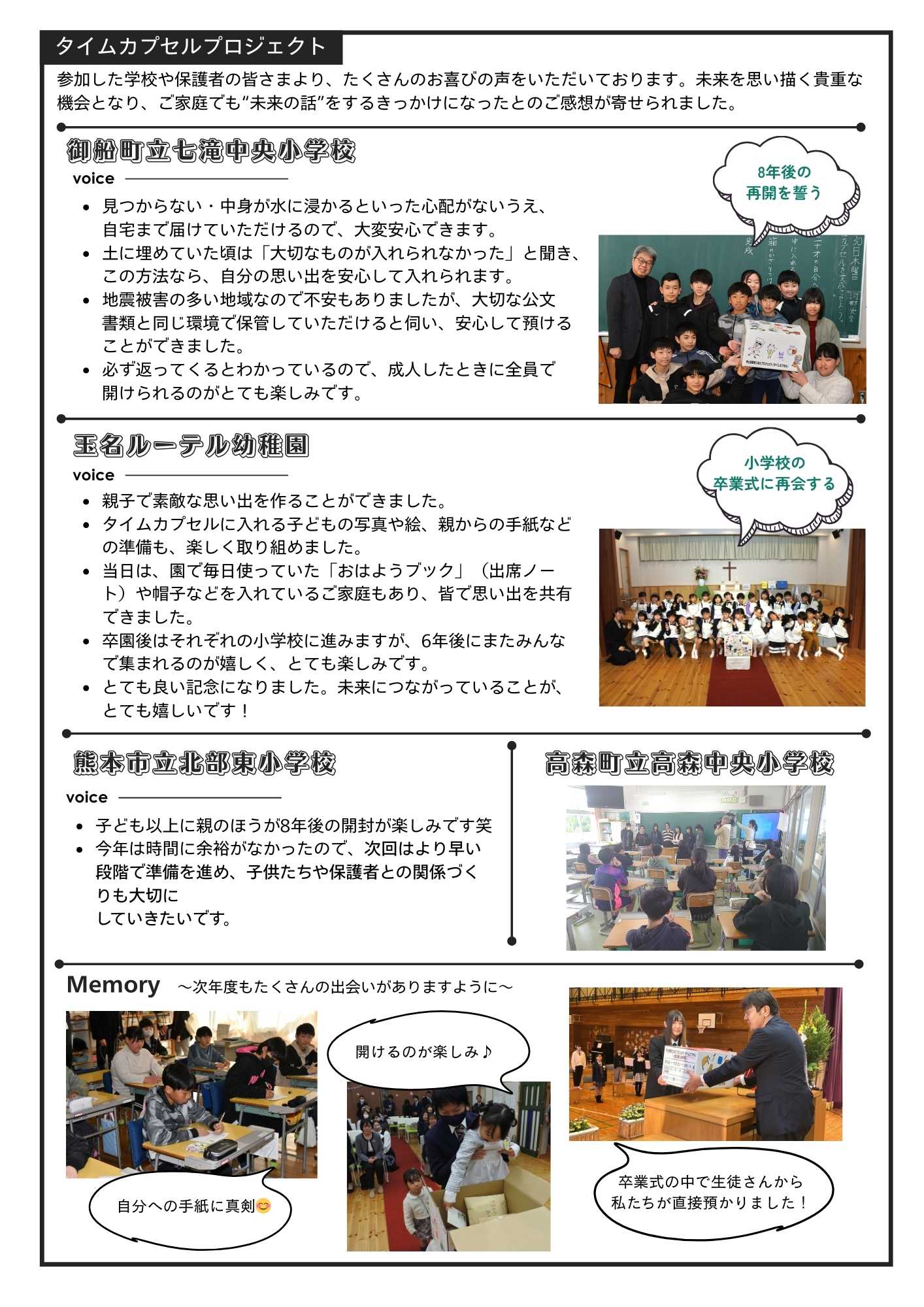 今年度は、葦北郡芦北町の田浦小学校と田浦中学校でもこの活動が行われました。生徒さんが、今の気持ちや将来の夢を語ってくれました。未来に開けるその日まで、子どもたちの想いが大切に保管されます。